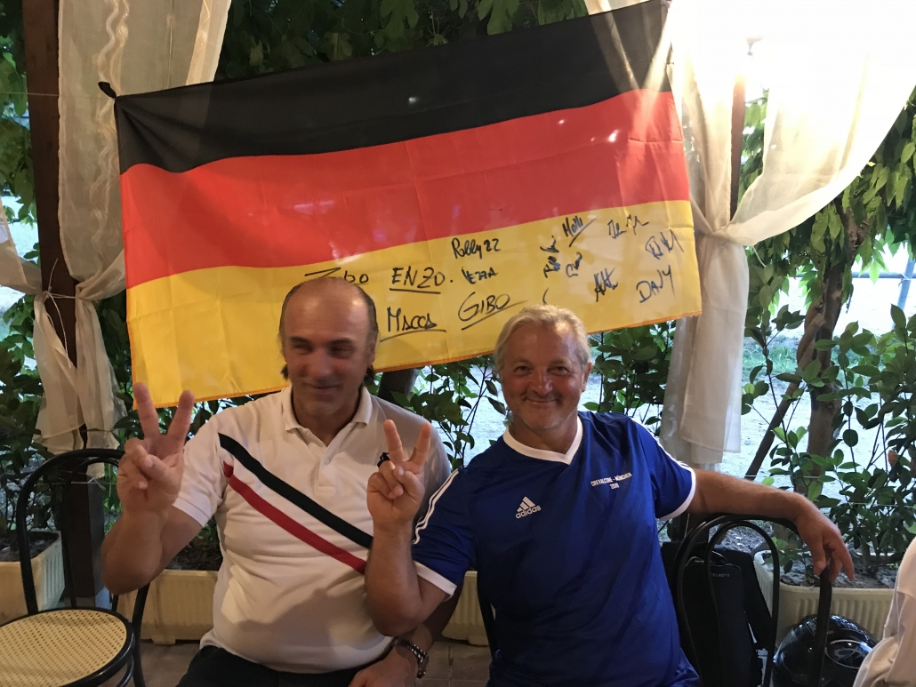 Zum Anpfiff des Spiels um 18.00 Uhr im Stadion von San Giovanni in Persiceto glühte der Tag intensiv nach. Das Stadion, von Mussolini erbaut, bot eine prächtige Kulisse. Team Italien spekulierte wieder mal auf einen Sieg nach einer kleinen Serie von Niederlagen der letzten Jahre. Man muss sagen: Meist geht es eng zu wie beim Aufeinandertreffen unserer Nationalmannschaften. Diesmal machte unser Kroate Ranko den Unterschied. Ein feiner Fußballer, dem nur ein Bein zur Verfügung steht. Das zweite mit kaputtem Knie muss er mitschleppen und trotzdem reicht es, um 5 Tore zu machen. Team Deutschland München Ost gewann die Hitzeschlacht von San Giovanni mit 8:3. Technische waren die einzigen Leckerbissen, die an diesem Wochenende dünn gesät waren. Enzo, der italienische Keeper, hatte uns mit einem Karius-mässigen Schnitzer auf die Siegerstraße geworfen. Dem kurzfristig verpflichteten Schiedsrichter Molly, Münchens große Liebe aus unserer Lädierten-Liste, war seine mangelnde Praxis bei Abseitsentscheidungen anzumerken. Für einen verpassten Elfmeterpfiff für Team Italien revanchierte er sich prompt mit dem Versprechen: „Dopo partita: birra per tutti.“ Was Proteste im Keim überschwemmte.